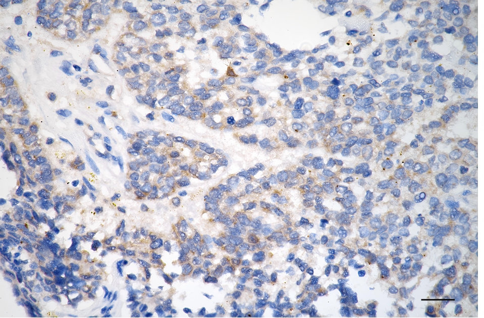 Immunohistochemistry was performed on paraffin-embedded human breast carcinoma using amyloid beta precursor like protein 2 antibody. Antigen retrieval was done in sodium citrate buffer (pH 6.0). DAB was used for detection, with hematoxylin counterstaining. Images were acquired using a Nikon Ci-L Plus microscope (40× objective). Scale bar: 25 μm.