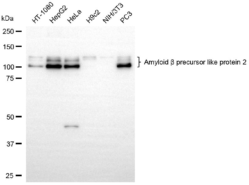 Western blotting analysis using amyloid beta precursor like protein 2 antibody. Total cell lysates (30 μg) from various cell lines were loaded and separated by SDS-PAGE. The blot was incubated with amyloid beta precursor like protein 2 antibody and HRP-conjugated goat anti-rabbit secondary antibody respectively.