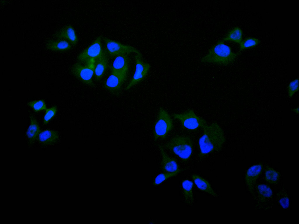 Immunofluorescence staining of Hela cell with CSB-RA238916A0HU at 1:50 , counter-stained with DAPI. The cells were fixed in 4% formaldehyde, permeabilized using 0.2% Triton X-100 and blocked in 10% normal Goat Serum. The cells were then incubated with the antibody overnight at 4°C. The secondary antibody was Alexa Fluor 488-congugated AffiniPure Goat Anti-Rabbit IgG(H+L).