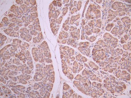 IHC image of CSB-RA238916A0HU diluted at 1:100 and staining in paraffin-embedded human pancreatic tissue performed on a Leica BondTM system. After dewaxing and hydration, antigen retrieval was mediated by high pressure in a citrate buffer (pH 6.0). Section was blocked with 10% normal goat serum 30min at RT. Then primary antibody (1% BSA) was incubated at 4°C overnight. The primary is detected by a Goat anti-rabbit polymer IgG labeled by HRP and visualized using 0.05% DAB.