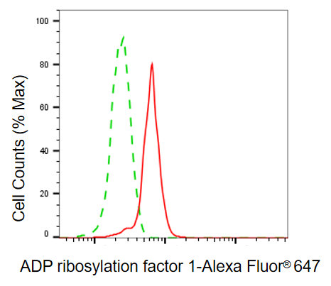 Flow cytometric analysis of ADP ribosylation factor 1 expression in C2C12 cells using ADP ribosylation factor 1 antibody. Green, isotype control; red, ADP ribosylation factor 1.