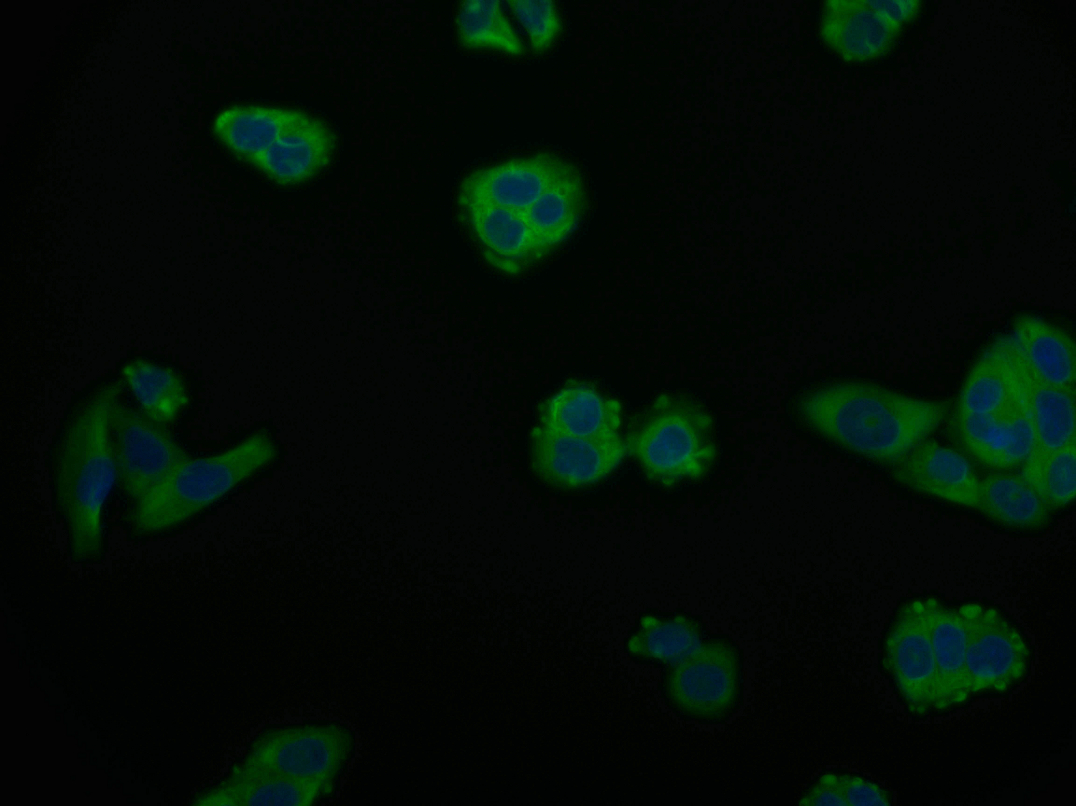 Immunofluorescence staining of PC-3 cell with CSB-RA216908A0HU at 1:50, counter-stained with DAPI. The cells were fixed in 4% formaldehyde and blocked in 10% normal Goat Serum. The cells were then incubated with the antibody overnight at 4°C. The secondary antibody was Alexa Fluor 559-congugated AffiniPure Goat Anti-Rabbit IgG(H+L).