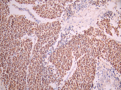 IHC image of CSB-RA164774A0HU diluted at 1:100 and staining in paraffin-embedded human lung cancer performed on a Leica BondTM system. After dewaxing and hydration, antigen retrieval was mediated by high pressure in a citrate buffer (pH 6.0). Section was blocked with 10% normal goat serum 30min at RT. Then primary antibody (1% BSA) was incubated at 4°C overnight. The primary is detected by a Goat anti-rabbit polymer IgG labeled by HRP and visualized using 0.05% DAB.