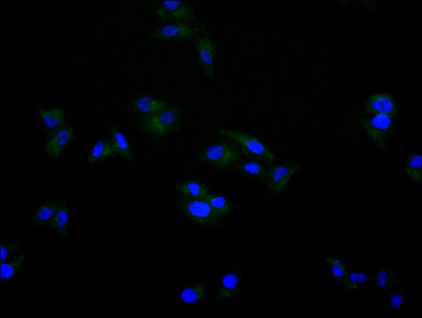 Immunofluorescence staining of Hela cell with CSB-RA944847A0HU at 1:50, counter-stained with DAPI. The cells were fixed in 4% formaldehyde, permeabilized using 0.2% Triton X-100 and blocked in 10% normal Goat Serum. The cells were then incubated with the antibody overnight at 4°C. The secondary antibody was Alexa Fluor 488-congugated AffiniPure Goat Anti-Rabbit IgG(H+L).