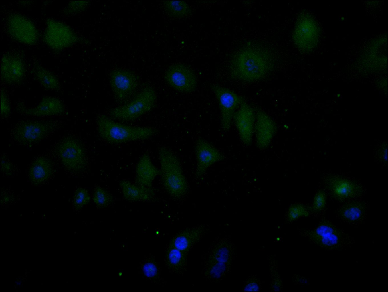 Immunofluorescence staining of Hela cell with CSB-RA963681A0HU at 1:50, counter-stained with DAPI. The cells were fixed in 4% formaldehyde, permeabilized using 0.2% Triton X-100 and blocked in 10% normal Goat Serum. The cells were then incubated with the antibody overnight at 4°C. The secondary antibody was Alexa Fluor 488-congugated AffiniPure Goat Anti-Rabbit IgG(H+L).