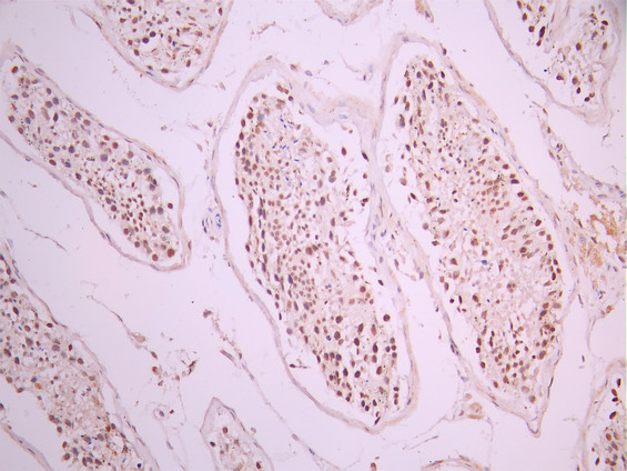 IHC image of CSB-RA014345A0HU diluted at 1:100 and staining in paraffin-embedded human testis tissue performed on a Leica BondTM system. After dewaxing and hydration, antigen retrieval was mediated by high pressure in a citrate buffer (pH 6.0). Section was blocked with 10% normal goat serum 30min at RT. Then primary antibody (1% BSA) was incubated at 4°C overnight. The primary is detected by a Goat anti-rabbit polymer IgG labeled by HRP and visualized using 0.05% DAB.