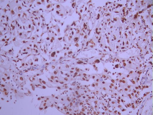 IHC image of CSB-RA014345A0HU diluted at 1:100 and staining in paraffin-embedded human cervical cancer performed on a Leica BondTM system. After dewaxing and hydration, antigen retrieval was mediated by high pressure in a citrate buffer (pH 6.0). Section was blocked with 10% normal goat serum 30min at RT. Then primary antibody (1% BSA) was incubated at 4°C overnight. The primary is detected by a Goat anti-rabbit polymer IgG labeled by HRP and visualized using 0.05% DAB.