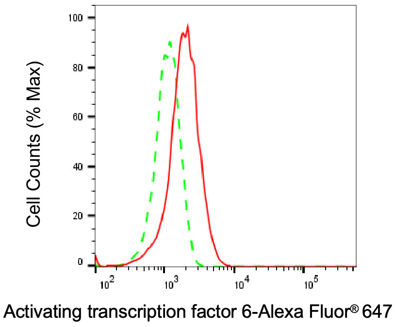Flow cytometric analysis of Activating transcription factor 6 expression in HepG2 cells using Activating transcription factor 6 antibody. Green, isotype control; red, Activating transcription factor 6.