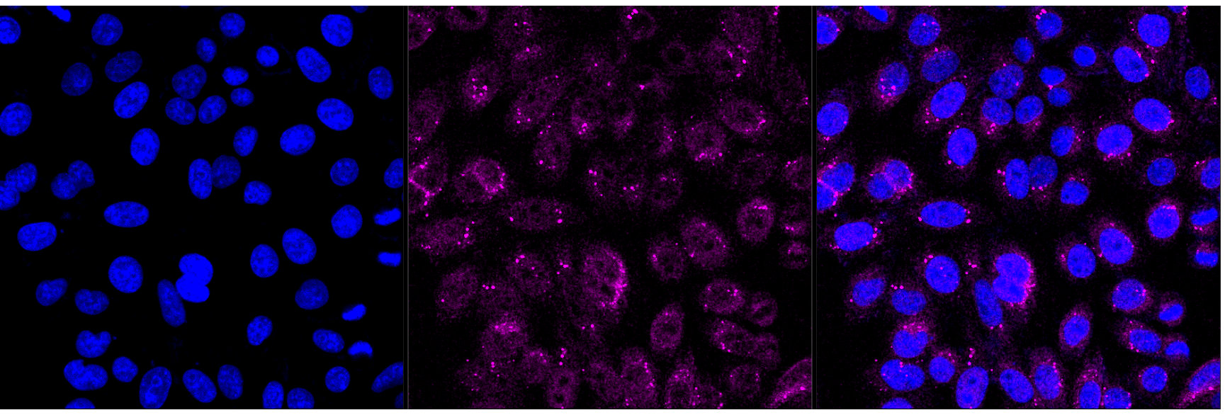 Immunocytochemical staining of HepG2 cells with Activating transcription factor 6 antibody. Nuclei were stained blue with DAPI; Activating transcription factor 6 was stained magenta with Alexa Fluor? 647. Images were taken using Leica stellaris 5. Protein abundance based on laser Intensity and smart gain: Medium. Scale bar, 20 μm.
