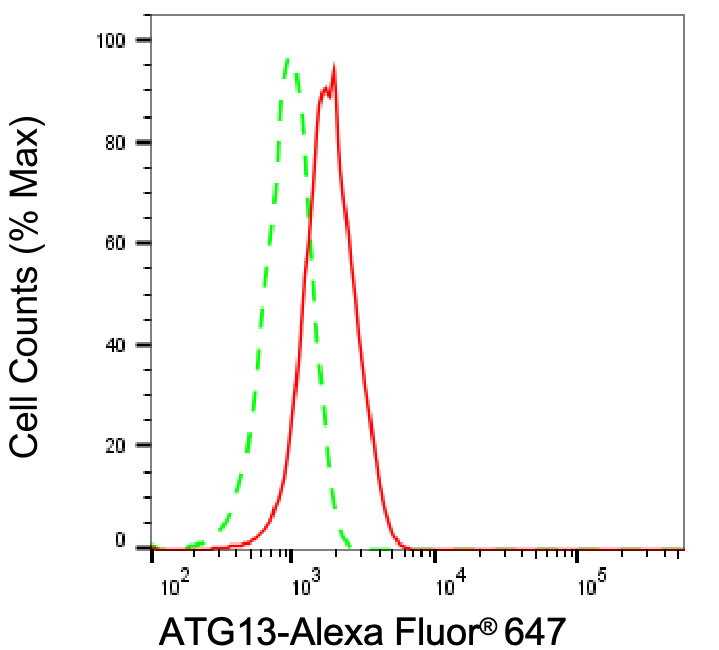 Flow cytometric analysis of ATG13 expression in HT-1080 cells using ATG13 antibody. Green, isotype control; red, ATG13.