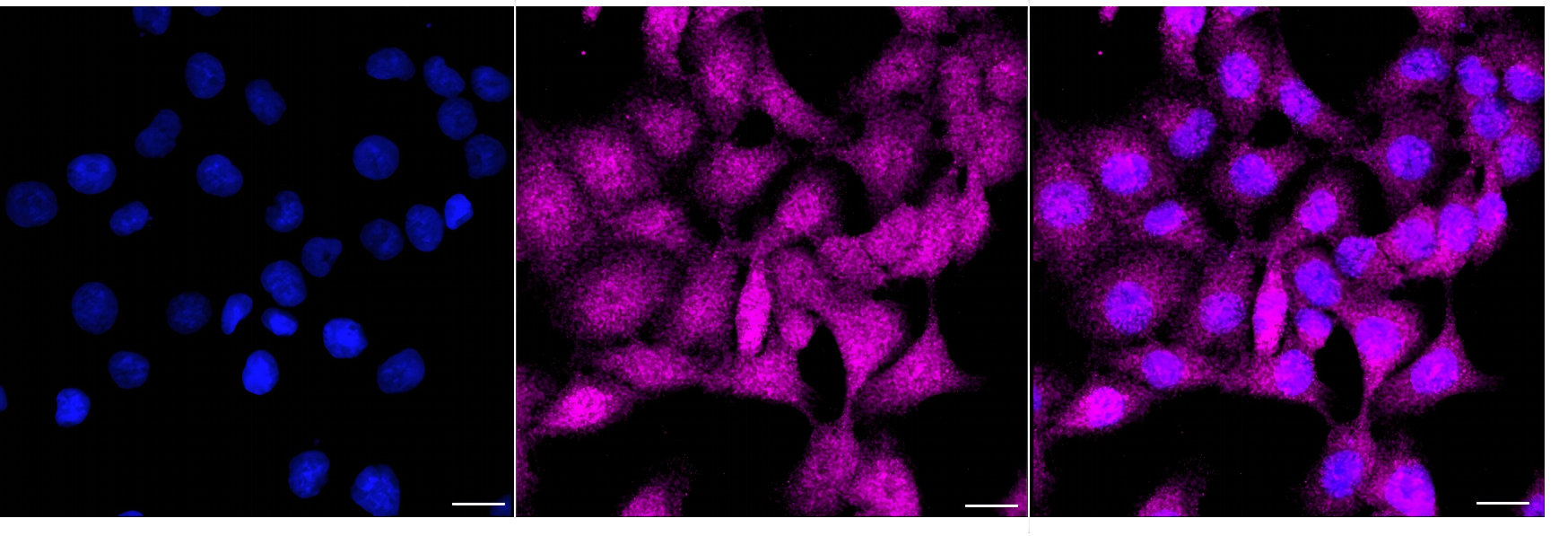 Immunocytochemical staining of HT-1080 cells with ATG13 antibody. Nuclei were stained blue with DAPI; ATG13 was stained magenta with Alexa Fluor? 647. Images were taken using Leica stellaris 5. Protein abundance based on laser Intensity and smart gain: Medium. Scale bar, 20 μm.