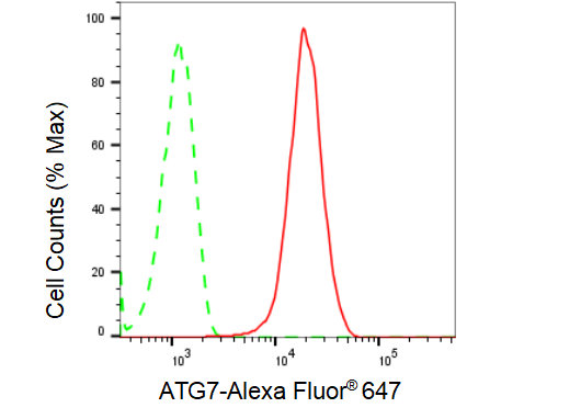 Flow cytometric analysis of ATG7 expression in HepG2 cells using ATG7 antibody. Green, isotype control; red, ATG7.