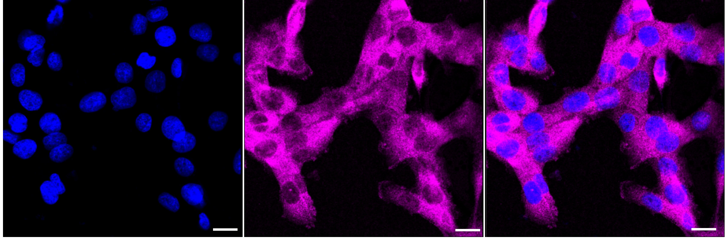 Immunocytochemical staining of HT-1080 cells with ATG7 antibody. Nuclei were stained blue with DAPI; ATG7 was stained magenta with Alexa Fluor? 647. Images were taken using Leica stellaris 5. Protein abundance based on laser Intensity and smart gain: Medium. Scale bar: 20 μm.
