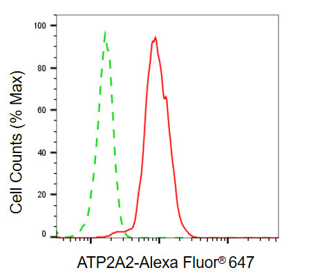 Flow cytometric analysis of ATP2A2 expression in HeLa cells using ATP2A2 antibody. Green, isotype control; red, ATP2A2.