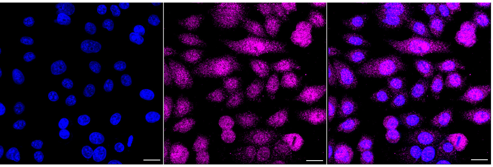 Immunocytochemical staining of HepG2 cells with ATP6V1A antibody. Nuclei were stained blue with DAPI; ATP6V1A was stained magenta with Alexa Fluor? 647. Images were taken using Leica stellaris 5. Protein abundance based on laser Intensity and smart gain: Low. Scale bar, 20 μm.