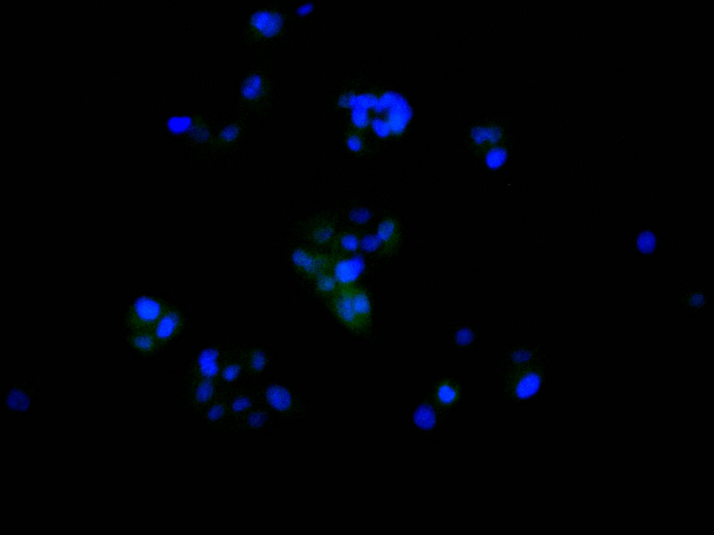 Immunofluorescence staining of HepG2 cell with CSB-RA178469A0HU at 1:50, counter-stained with DAPI. The cells were fixed in 4% formaldehyde, permeabilized using 0.2% Triton X-100 and blocked in 10% normal Goat Serum. The cells were then incubated with the antibody overnight at 4°C. The secondary antibody was Alexa Fluor 488-congugated AffiniPure Goat Anti-Rabbit IgG(H+L).