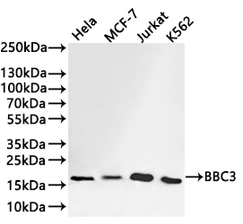 Positive WB detected in: Hela whole cell lysate(30μg), MCF-7 whole cell lysate(30μg), Jurkat whole cell lysate(30μg), K562 whole cell lysate(30μg)