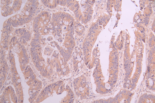 IHC image of CSB-RA147388A0HU diluted at 1:100 and staining in paraffin-embedded human colorectal cancer performed on a Leica BondTM system. After dewaxing and hydration, antigen retrieval was mediated by high pressure in a citrate buffer (pH 6.0). Section was blocked with 10% normal goat serum 30min at RT. Then primary antibody (1% BSA) was incubated at 4°C overnight. The primary is detected by a Goat anti-rabbit polymer IgG labeled by HRP and visualized using 0.05% DAB.