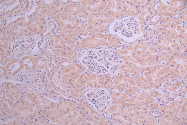 IHC image of CSB-RA147388A0HU diluted at 1:100 and staining in paraffin-embedded human kidney tissue performed on a Leica BondTM system. After dewaxing and hydration, antigen retrieval was mediated by high pressure in a citrate buffer (pH 6.0). Section was blocked with 10% normal goat serum 30min at RT. Then primary antibody (1% BSA) was incubated at 4°C overnight. The primary is detected by a Goat anti-rabbit polymer IgG labeled by HRP and visualized using 0.05% DAB.