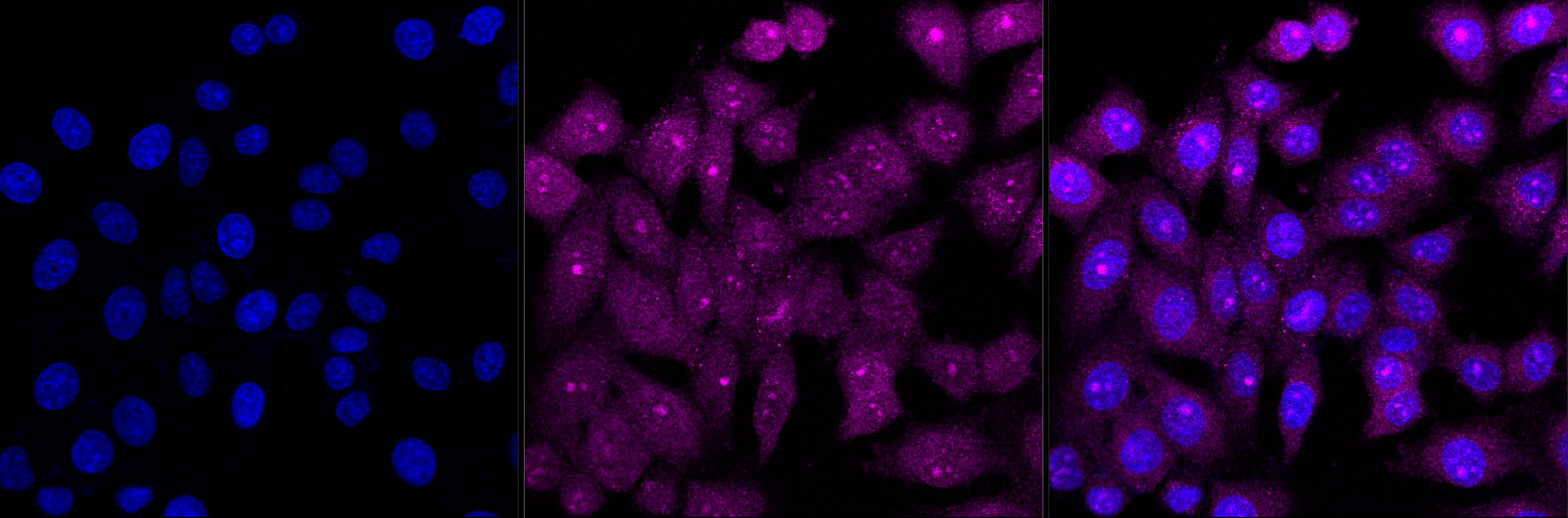 Immunocytochemical staining of HepG2 cells with BCR antibody. Nuclei were stained blue with DAPI; BCR was stained magenta with Alexa Fluor? 647. Images were taken using Leica stellaris 5. Protein abundance based on laser Intensity and smart gain: Medium. Scale bar, 20 μm.