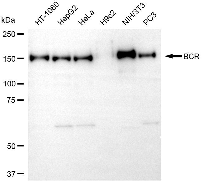 Western blotting analysis using BCR antibody. Total cell lysates (30 μg) from various cell lines were loaded and separated by SDS-PAGE. The blot was incubated with BCR antibody and HRP-conjugated goat anti-rabbit secondary antibody respectively.