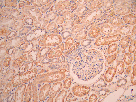 IHC image of CSB-RA002831MA1HU diluted at 1:50 and staining in paraffin-embedded human kidney tissue performed on a Leica BondTM system. After dewaxing and hydration, antigen retrieval was mediated by high pressure in a citrate buffer (pH 6.0). Section was blocked with 10% normal goat serum 30min at RT. Then primary antibody (1% BSA) was incubated at 4°C overnight. The primary is detected by a Anti-Human lgG, Fcy Fragment Specific labeled by HRP and visualized using 0.05% DAB.