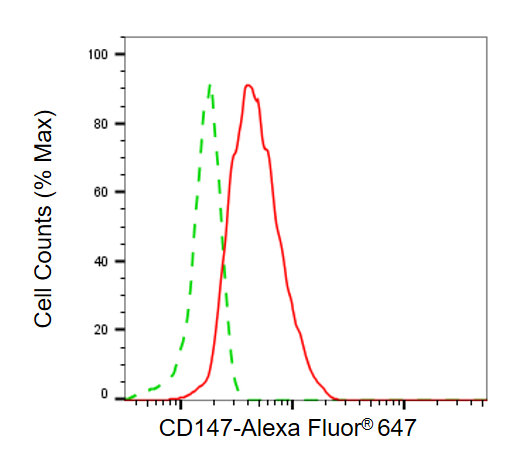 Flow cytometric analysis of CD147 expression in HepG2 cells using CD147 antibody. Green, isotype control; red, CD147.
