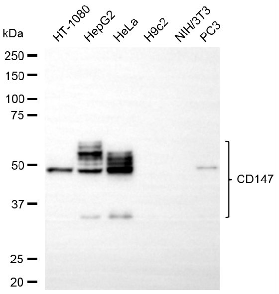 Western blotting analysis using CD147 antibody. Total cell lysates (30 μg) from various cell lines were loaded and separated by SDS-PAGE. The blot was incubated with CD147 antibody and HRP-conjugated goat anti-rabbit secondary antibody respectively.