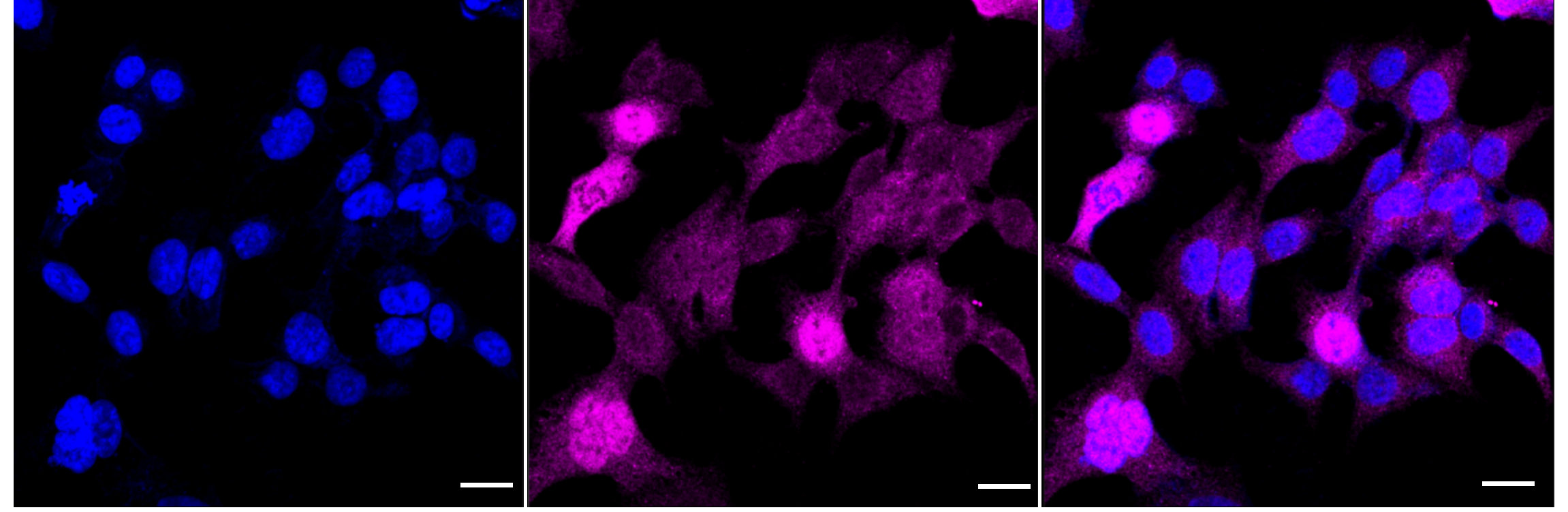 Immunocytochemical staining of HAP-1 cells with BUB1 antibody. Nuclei were stained blue with DAPI; BUB1 was stained magenta with Alexa Fluor? 647. Images were taken using Leica stellaris 5. Protein abundance based on laser Intensity and smart gain: Medium. Scale bar: 20 μm.