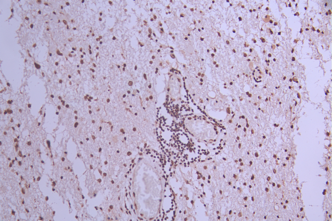 IHC image of CSB-RA549049A0HU diluted at 1:100 and staining in paraffin-embedded human glioma cancer performed on a Leica BondTM system. After dewaxing and hydration, antigen retrieval was mediated by high pressure in a citrate buffer (pH 6.0). Section was blocked with 10% normal goat serum 30min at RT. Then primary antibody (1% BSA) was incubated at 4°C overnight. The primary is detected by a Goat anti-rabbit polymer IgG labeled by HRP and visualized using 0.05% DAB.