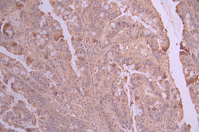 IHC image of CSB-RA829042A0HU diluted at 1:100 and staining in paraffin-embedded human colorectal cancer performed on a Leica BondTM system. After dewaxing and hydration, antigen retrieval was mediated by high pressure in a citrate buffer (pH 6.0). Section was blocked with 10% normal goat serum 30min at RT. Then primary antibody (1% BSA) was incubated at 4°C overnight. The primary is detected by a Goat anti-rabbit polymer IgG labeled by HRP and visualized using 0.05% DAB.