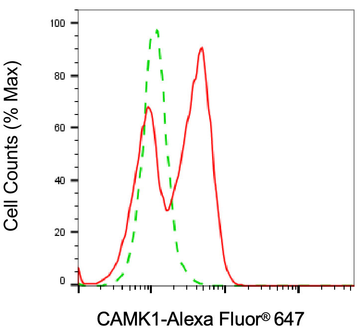 Flow cytometric analysis of CAMK1 expression in HeLa cells using CAMK1 antibody. Green, isotype control; red, CAMK1.