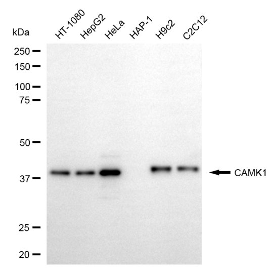 Western blotting analysis using CAMK1 antibody. Total cell lysates (30 μg) from various cell lines were loaded and separated by SDS-PAGE. The blot was incubated with CAMK1 antibody and HRP-conjugated goat anti-rabbit secondary antibody respectively.
