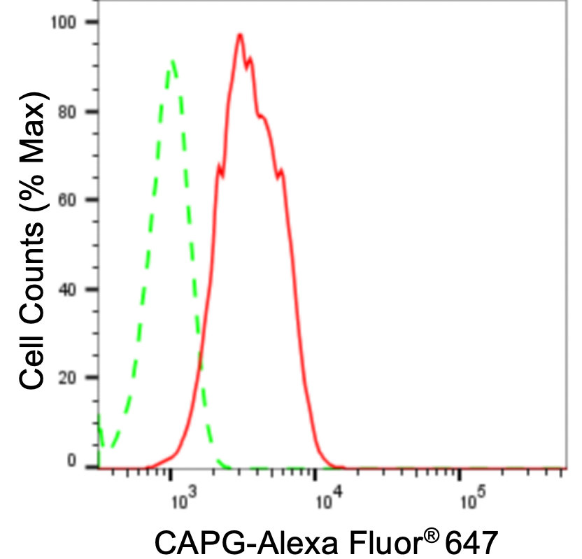 Flow cytometric analysis of CAPG expression in C2C12 cells using CAPG antibody. Green, isotype control; red, CAPG.