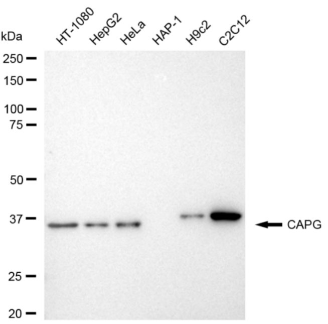 Western blotting analysis using CAPG antibody. Total cell lysates (30 μg) from various cell lines were loaded and separated by SDS-PAGE. The blot was incubated with CAPG antibody and HRP-conjugated goat anti-rabbit secondary antibody respectively.