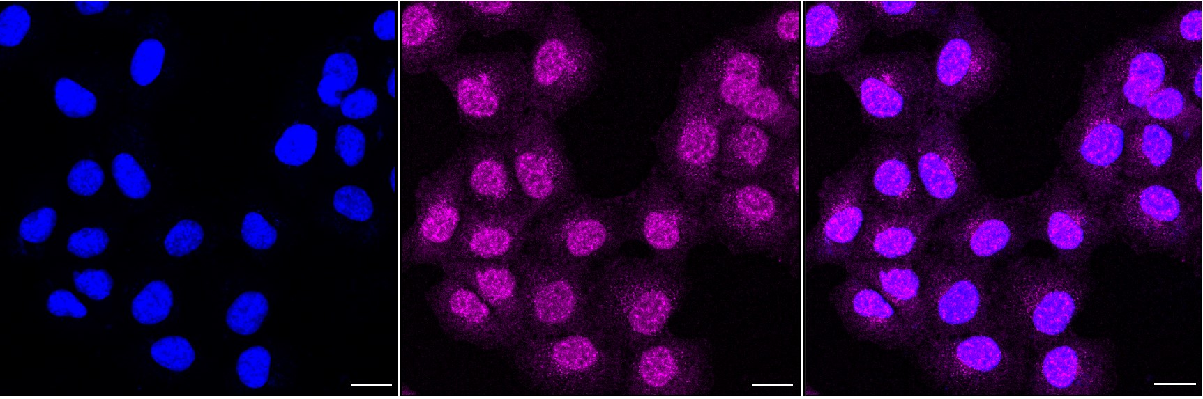 Immunocytochemical staining of HT-1080 cells with Calpain 2 antibody. Nuclei were stained blue with DAPI; Calpain 2 was stained magenta with Alexa Fluor? 647. Images were taken using Leica stellaris 5. Protein abundance based on laser Intensity and smart gain: Medium. Scale bar, 20 μm.