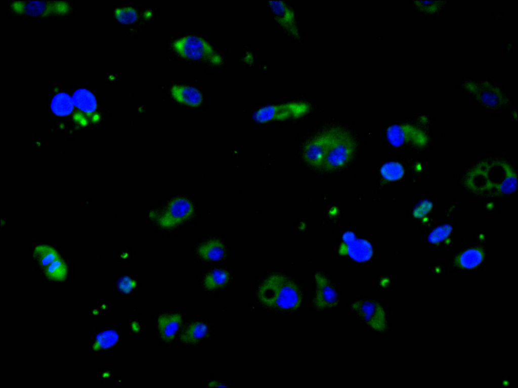 Immunofluorescence staining of A549 cell with CSB-RA827308A0HU at 1:50, counter-stained with DAPI. The cells were fixed in 4% formaldehyde and blocked in 10% normal Goat Serum. The cells were then incubated with the antibody overnight at 4°C. The secondary antibody was Alexa Fluor 488-congugated AffiniPure Goat Anti-Rabbit IgG(H+L).