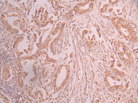 IHC image of CSB-RA827308A0HU diluted at 1:100 and staining in paraffin-embedded human cervical cancer performed on a Leica BondTM system. After dewaxing and hydration, antigen retrieval was mediated by high pressure in a citrate buffer (pH 6.0). Section was blocked with 10% normal goat serum 30min at RT. Then primary antibody (1% BSA) was incubated at 4°C overnight. The primary is detected by a Goat anti-rabbit polymer IgG labeled by HRP and visualized using 0.05% DAB.