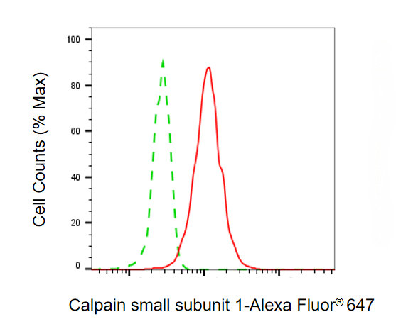 Flow cytometric analysis of Calpain small subunit 1 expression in HepG2 cells using Calpain small subunit 1 antibody. Green, isotype control; red, Calpain small subunit 1.