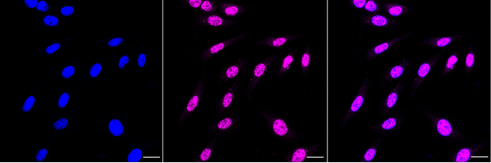 Immunocytochemical staining of HepG2 cells with Calpain small subunit 1 antibody. Nuclei were stained blue with DAPI; Calpain small subunit 1 was stained magenta with Alexa Fluor? 647. Images were taken using Leica stellaris 5. Protein abundance based on laser Intensity and smart gain: Medium. Scale bar, 20 μm.