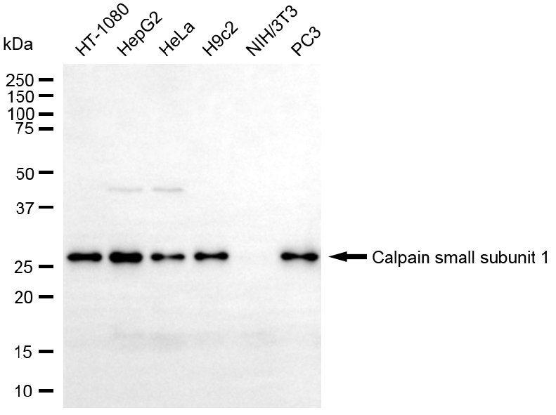 Western blotting analysis using calpain small subunit 1 antibody. Total cell lysates (20 μg) from various cell lines were loaded and separated by SDS-PAGE. The blot was incubated with calpain small subunit 1 antibody and HRP-conjugated goat anti-rabbit secondary antibody respectively.
