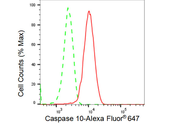 Flow cytometric analysis of Caspase 10 expression in HepG2 cells using Caspase 10 antibody. Green, isotype control; red, Caspase 10.
