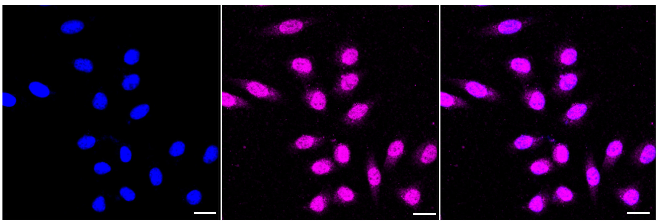 Immunocytochemical staining of HepG2 cells with Caspase 10 antibody. Nuclei were stained blue with DAPI; Caspase 10 was stained magenta with Alexa Fluor? 647. Images were taken using Leica stellaris 5. Protein abundance based on laser Intensity and smart gain: Medium. Scale bar: 20 μm.