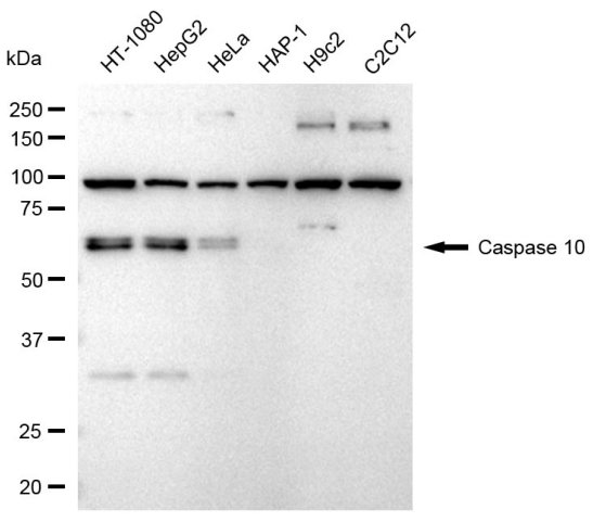 Western blotting analysis using Caspase 10 antibody. Total cell lysates (30 μg) from various cell lines were loaded and separated by SDS-PAGE. The blot was incubated with Caspase 10 antibody and HRP-conjugated goat anti-rabbit secondary antibody respectively.