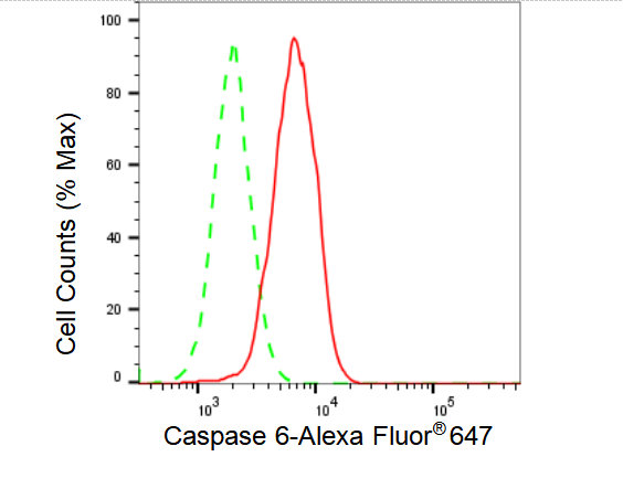 Flow cytometric analysis of Caspase 6 expression in HAP-1 cells using Caspase 6 antibody. Green, isotype control; red, Caspase 6.