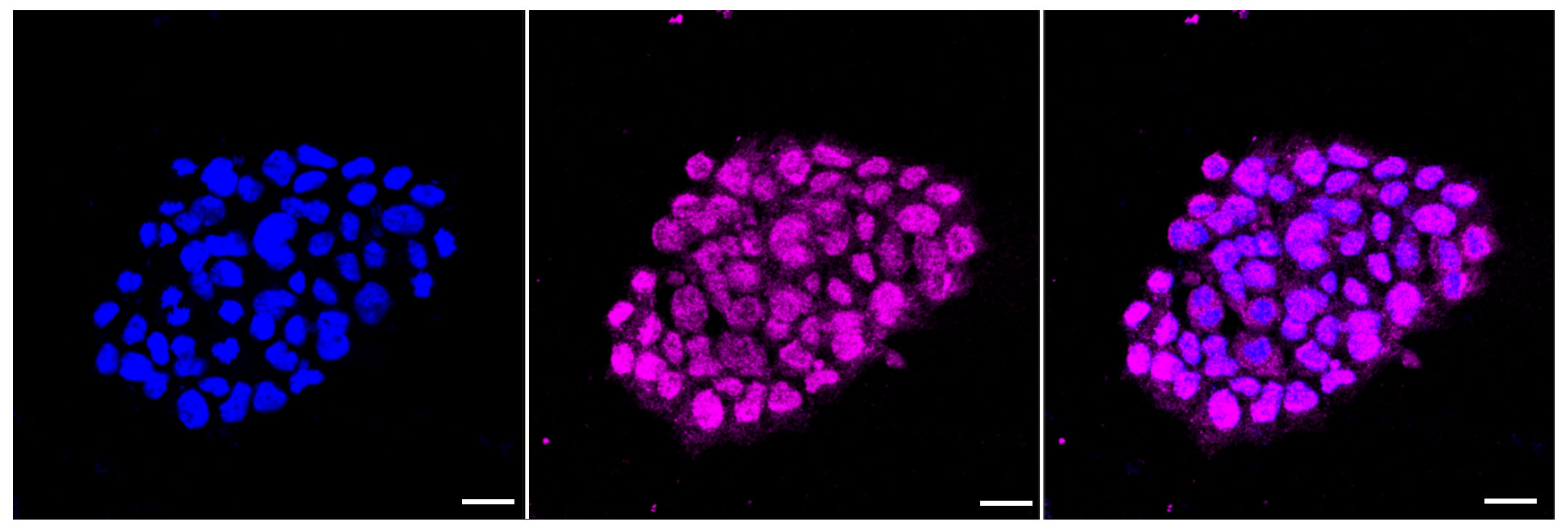 Immunocytochemical staining of HAP-1 cells with Caspase 6 antibody. Nuclei were stained blue with DAPI; Caspase 6 was stained magenta with Alexa Fluor? 647. Images were taken using Leica stellaris 5. Protein abundance based on laser Intensity and smart gain: Low. Scale bar: 20 μm.
