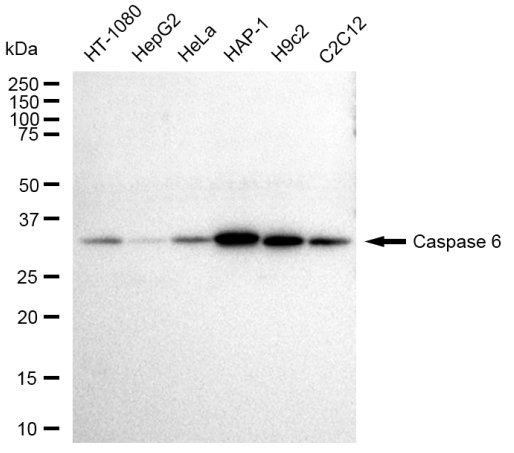 Western blotting analysis using Caspase 6 antibody. Total cell lysates (30 μg) from various cell lines were loaded and separated by SDS-PAGE. The blot was incubated with Caspase 6 antibody and HRP-conjugated goat anti-rabbit secondary antibody respectively.