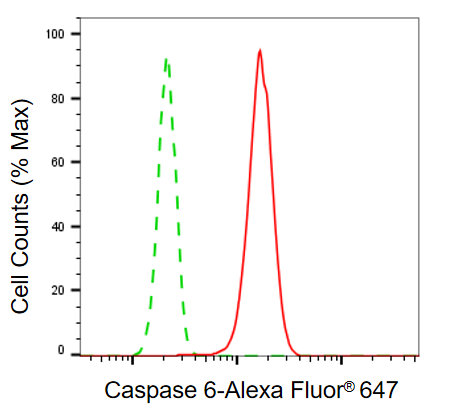Flow cytometric analysis of caspase 6 expression in HT-1080 cells using caspase 6 antibody. Green, isotype control; red, caspase 6.