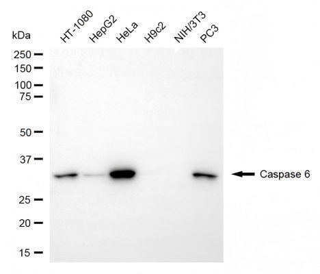 Western blotting analysis using caspase 6 antibody. Total cell lysates (30 μg) from various cell lines were loaded and separated by SDS-PAGE. The blot was incubated with caspase 6 antibody and HRP-conjugated goat anti-rabbit secondary antibody respectively.