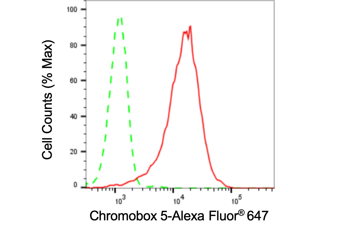Flow cytometric analysis of Chromobox 5 expression in HepG2 cells using Chromobox 5 antibody. Green, isotype control; red, Chromobox 5.